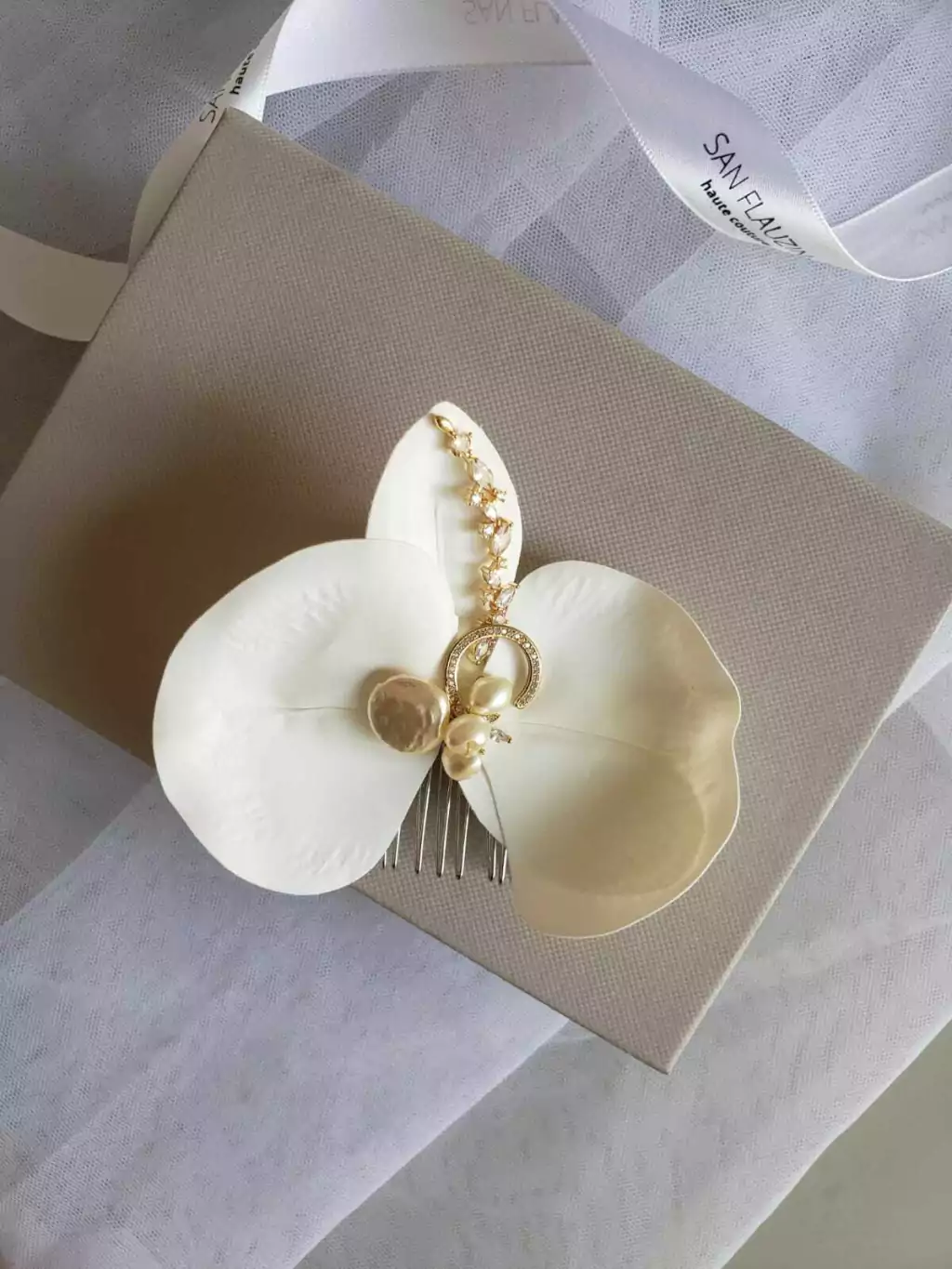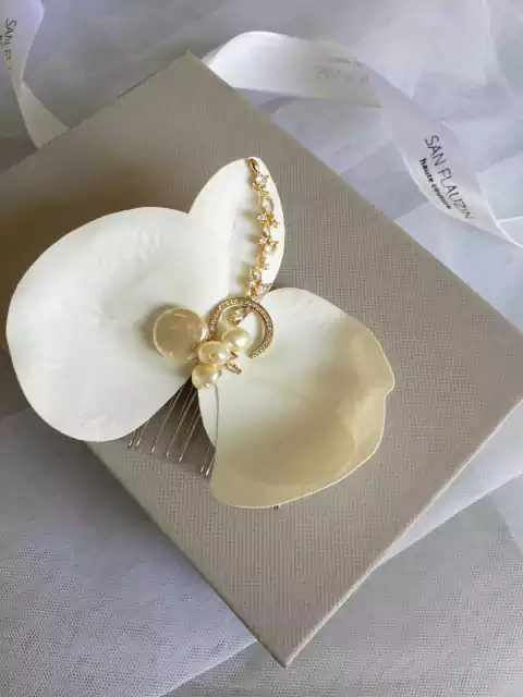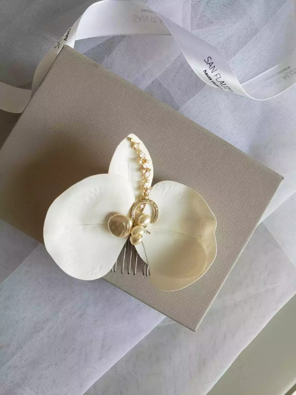 O acessório de cabelo para noiva "THERESE" é uma obra-prima de elegância e delicadeza. Este deslumbrante arranjo apresenta pin de orquídea branca, pérolas e cristais meticulosamente combinados para criar uma peça verdadeiramente única.