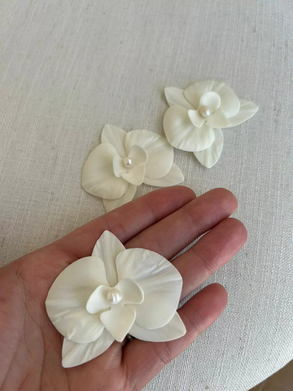 Adorne seu penteado nupcial com a elegância e a beleza natural do Arranjo Trio Mini Orquídeas Charlotte com pérolas de água doce natural. Este acessório de cabelo para noiva é projetado para proporcionar um toque sofisticado e encantador ao seu visual no grande dia.