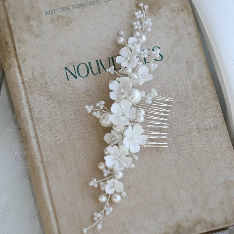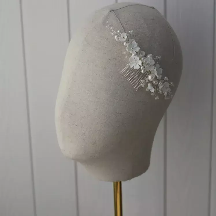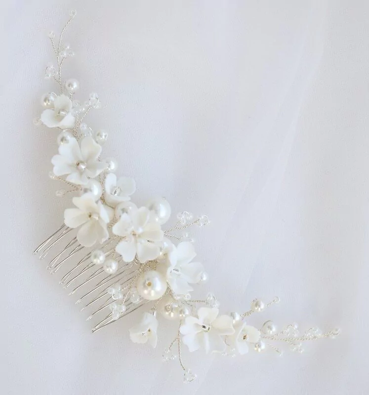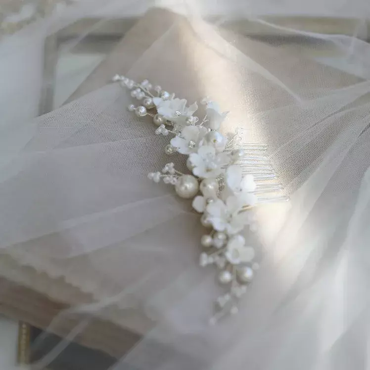 A disposição cuidadosa das flores, folhas e ramos esculpidos em porcelana fria na grinalda é um tributo à artesania artística. A base flexível e ajustável garante que ela se adapte perfeitamente ao penteado da noiva, proporcionando conforto ao longo do dia.