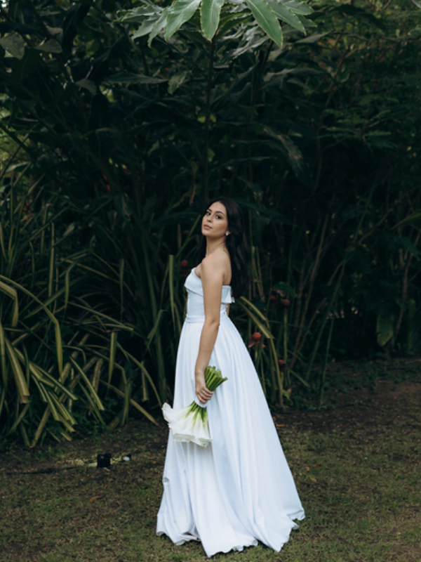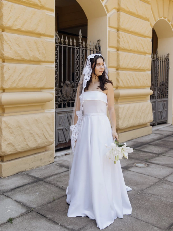 Com seu comprimento é longo, o Vestido Singele é ideal para casamentos diurnos ou cerimônias mais íntimas, proporcionando liberdade de movimento. Este vestido é perfeito para noivas que desejam um look minimalista inesquecível e autêntico no dia mais especial de suas vidas.